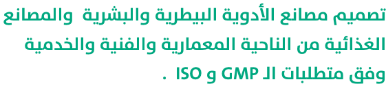- تصميم مصانع الأدوية والمصانع الغذائية من الناحية الانشائية والمعمارية والفنية والخدمية وفق متطلبات ممارسة التصنيع الجيد